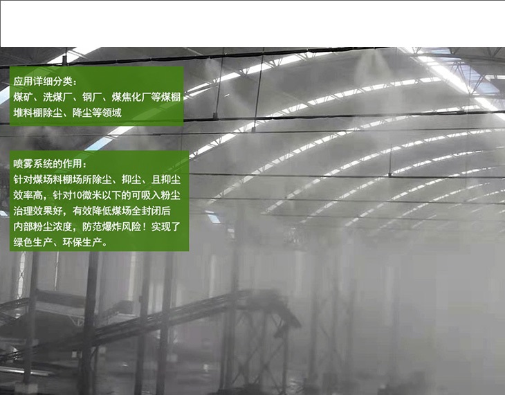 當水霧顆粒與塵埃顆粒直徑大小相近時,行程的吸附過濾、凝結的幾率較大,那么只要產(chǎn)生于粉塵顆粒大小相當?shù)奈⒚准壦F顆粒使其與之吸附,相互粘結,聚集并在自身重力的作用下沉降,就可達到降塵的目的,當水霧形成時產(chǎn)生負離子,粉塵中的正離子與水霧中的負離子結合,從而迅速降塵,水霧與干燥的粉塵解除,增加了空氣的濕度,同時吸收空氣潛熱,從而起到良好的降溫作用,水霧降塵技術產(chǎn)生的水霧顆粒大小主要集中在10-100微米左右,