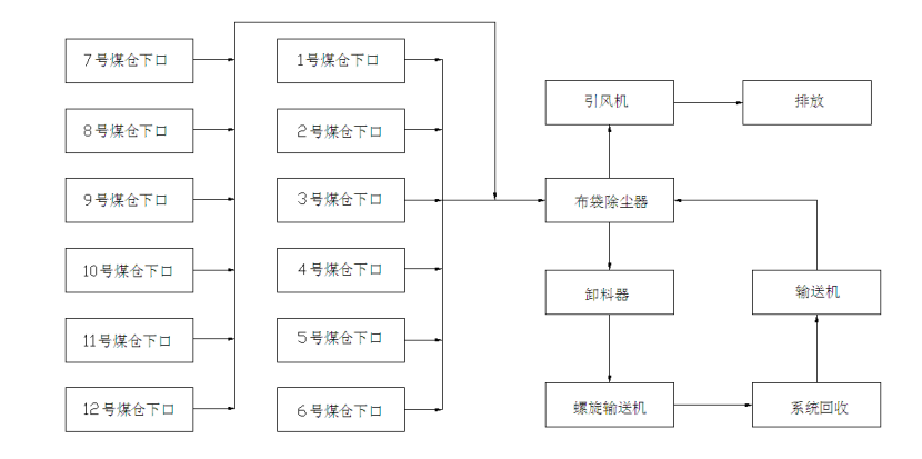 收塵系統(tǒng)整體布局采用集中風網(wǎng)設計,12個煤倉下料口及帶式輸送機頭、尾均布置收塵裝置,集中匯集進布袋除塵器當中過濾,粉塵顆粒通過卸料器進入螺旋輸送機,螺旋輸送機把粉塵顆粒送進集中回收站里。